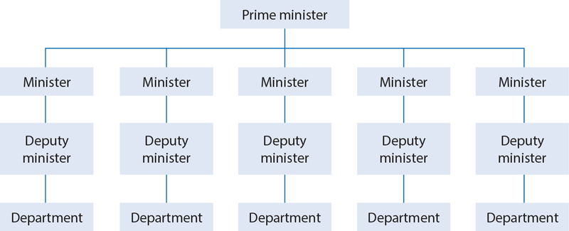 In a departmentalized cabinet system, each minister is officially responsible for his or her own departmental administration and policy development. Each department functions on its own, without formal organizational links to any other (see Figure 4.2). Policy making is largely incremental, a series of small and discrete initiatives to address new concerns and opportunities as they arise while remaining committed to past practices. There is little long-range planning, as each department addresses only matters it considers important, case by case, learning by experience which initiatives best suit its interests and the needs of its clientele. Cabinet itself possesses few, if any, policy coordinating institutions, enabling its members to develop a coherent and systematic approach to policy and program development across the entire government. The prime minister and closest advisers are the only cabinet members who are informed of all pending initiatives, and the prime minister alone is responsible for the coordination, planning, and timing of new undertakings and related decision making.